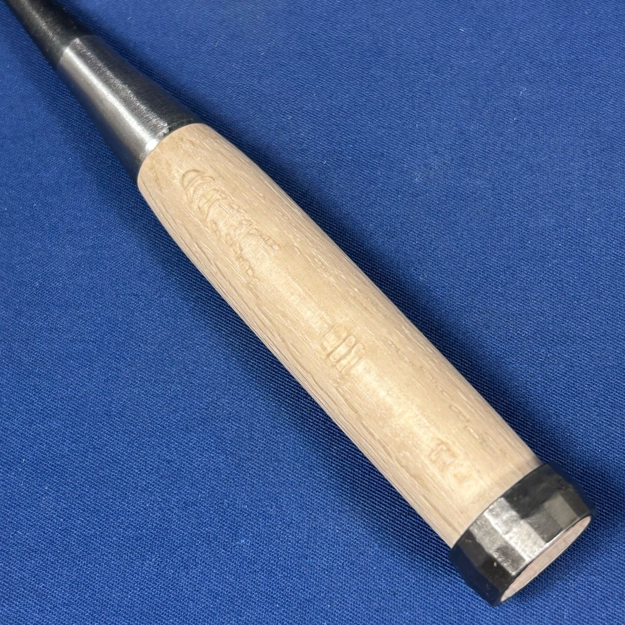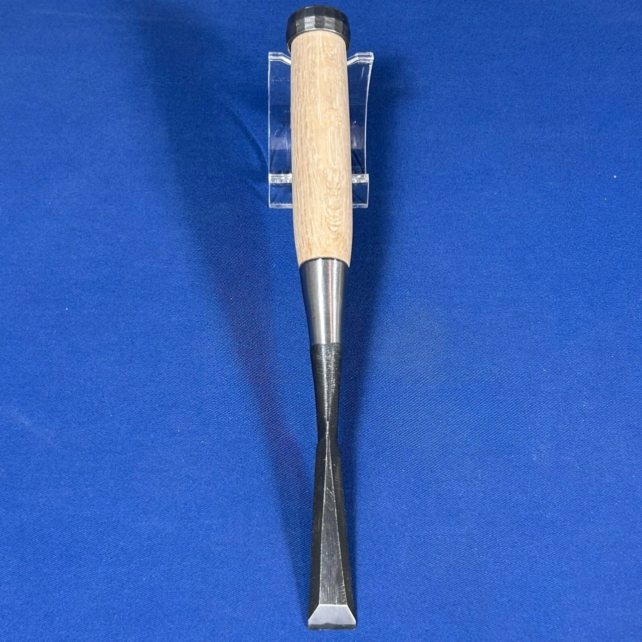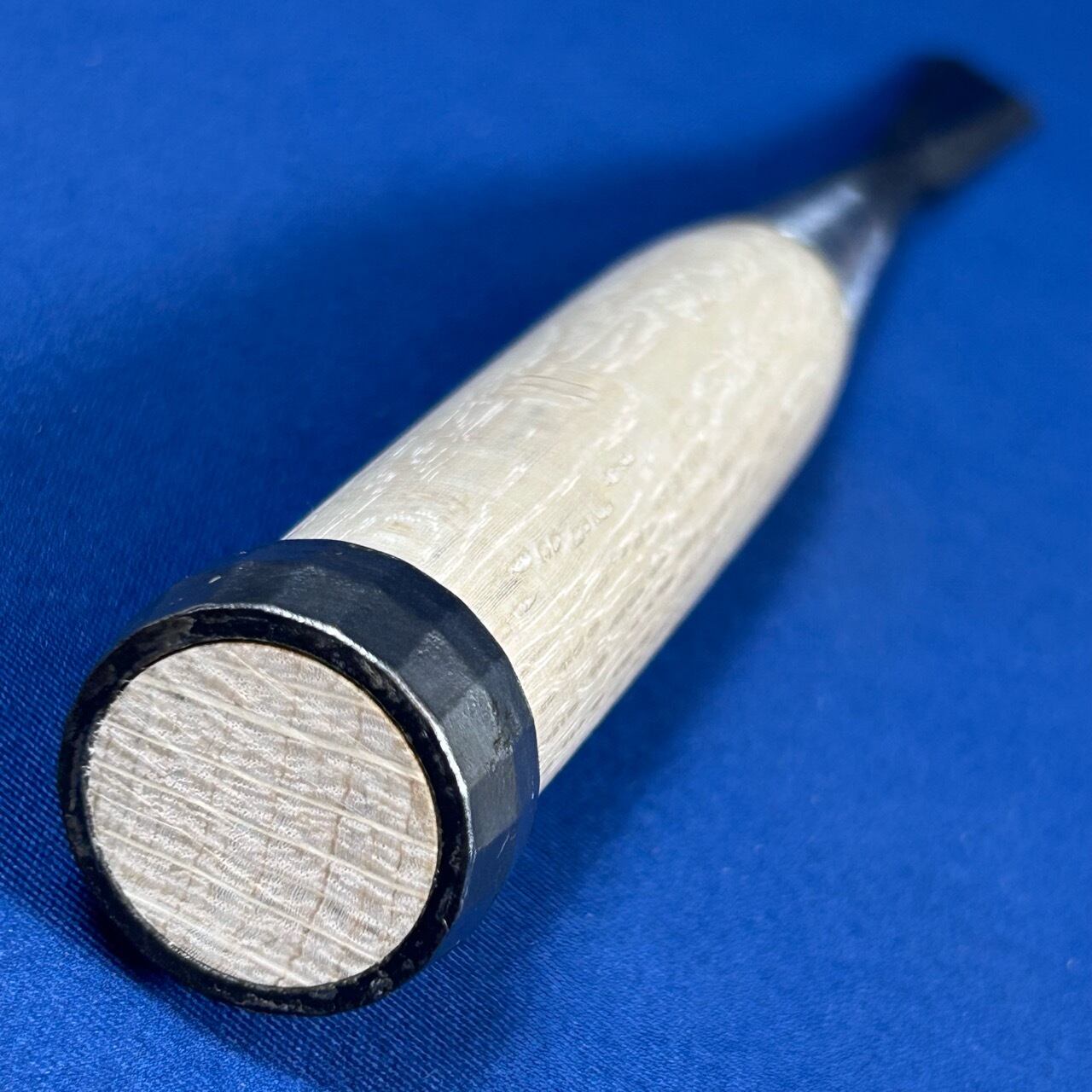 ◆主に仕上げで使う物なので下がり輪(桂)は付いておりませんが、こちらのバチ鑿は玄能で叩けるように下がり輪(桂)が付いております。