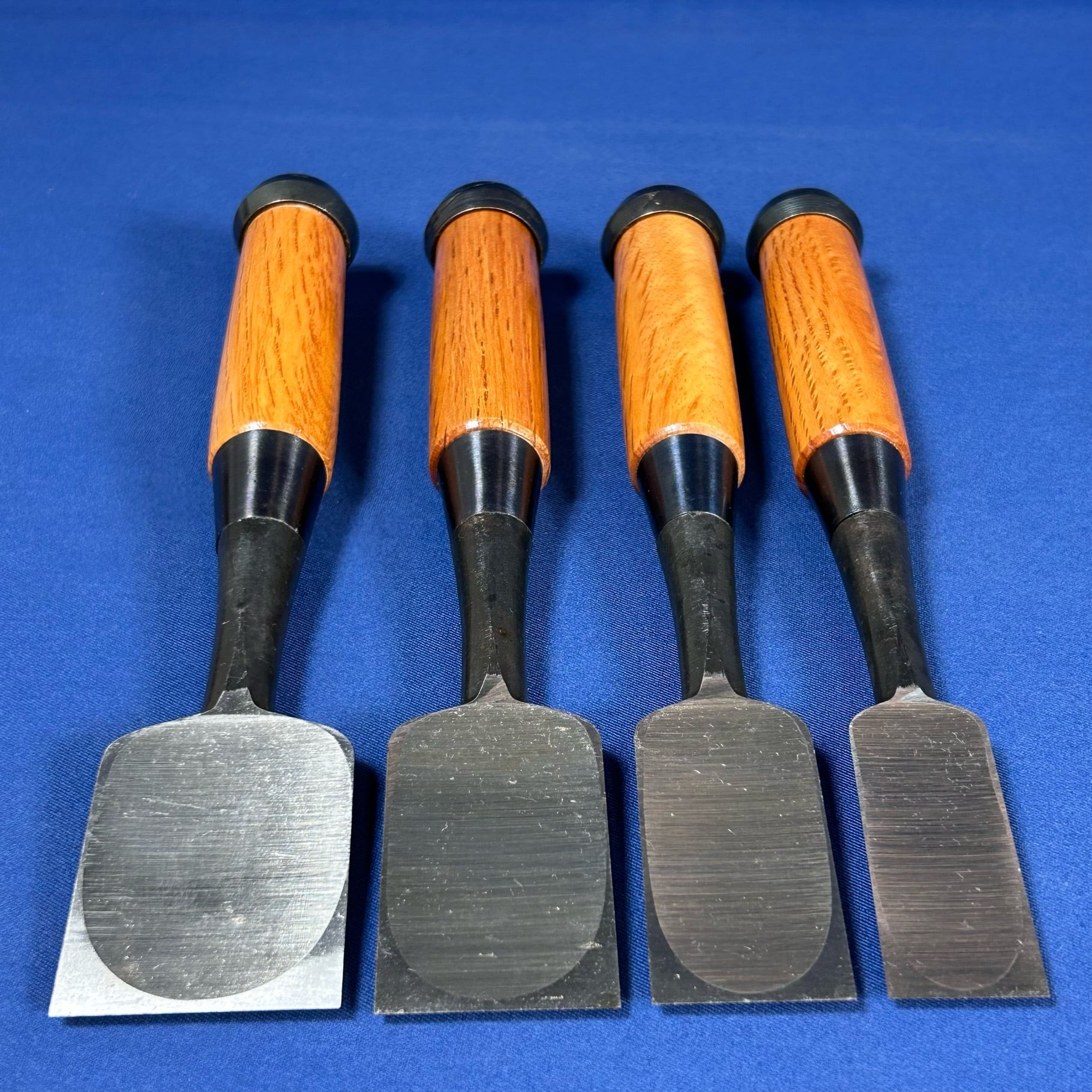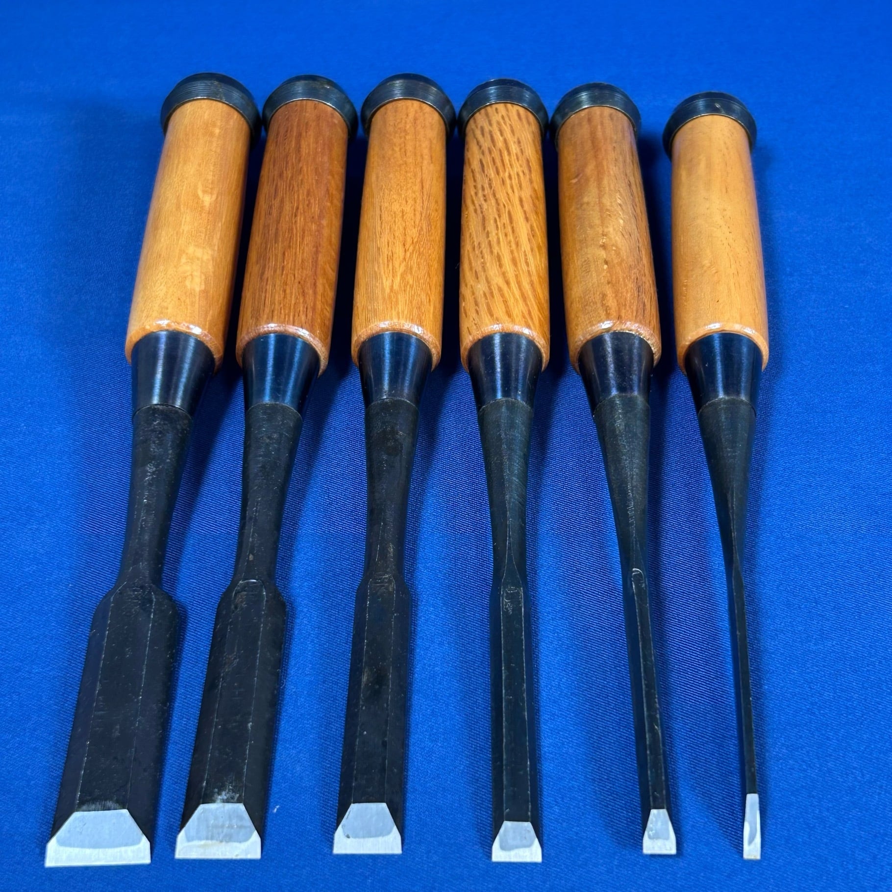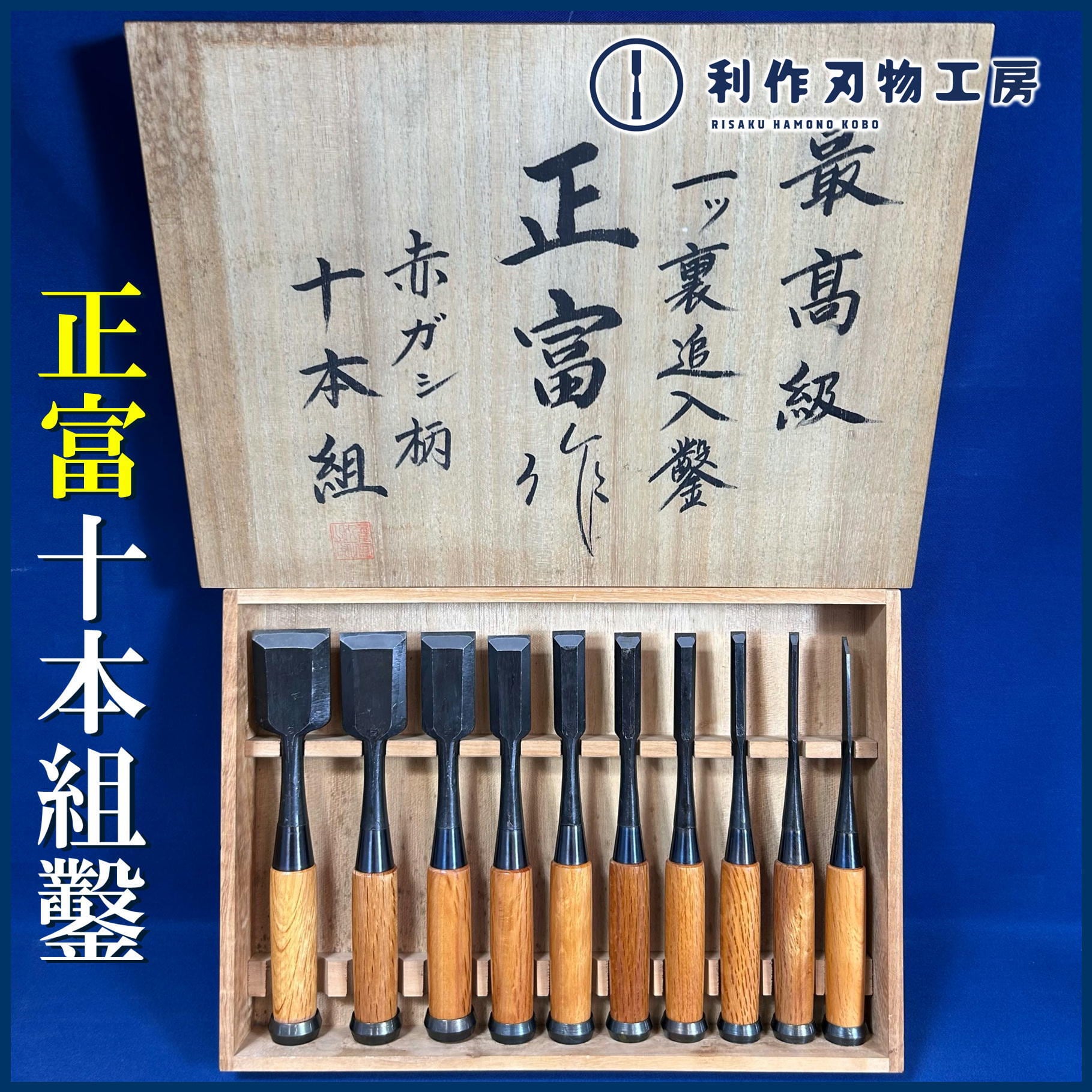 銘.正富 追入鑿(奴鑿) 10本組鑿 黒仕上げ 赤樫柄 かぶせ桐箱付【中古買取品/未使用品】