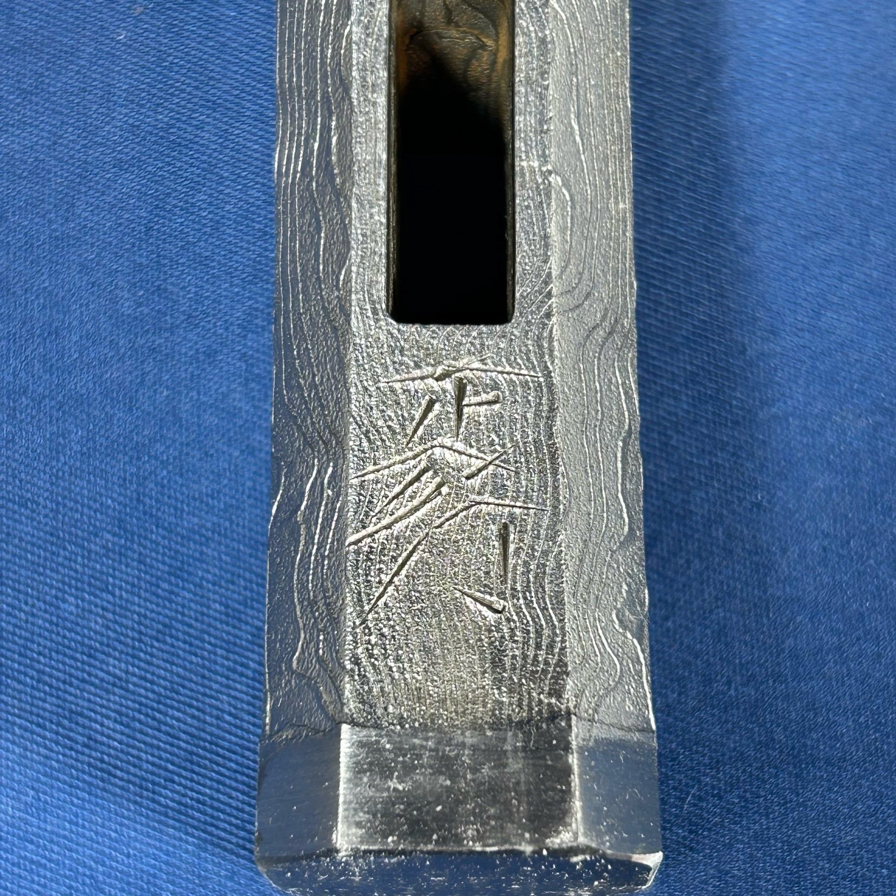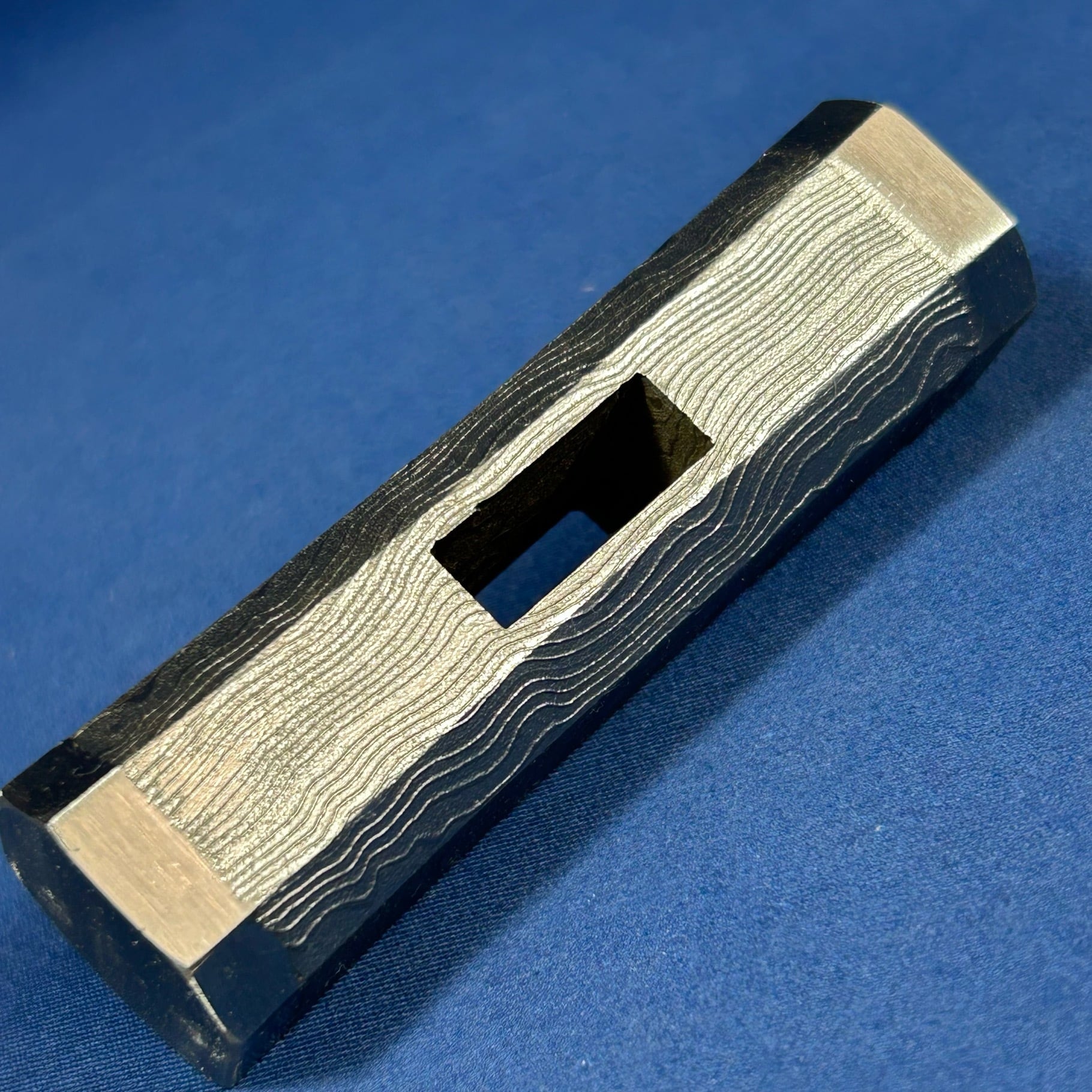 ・積層の地金の両端に鋼を鍛接し、木目部分をいぶし仕上げとした玄能です。